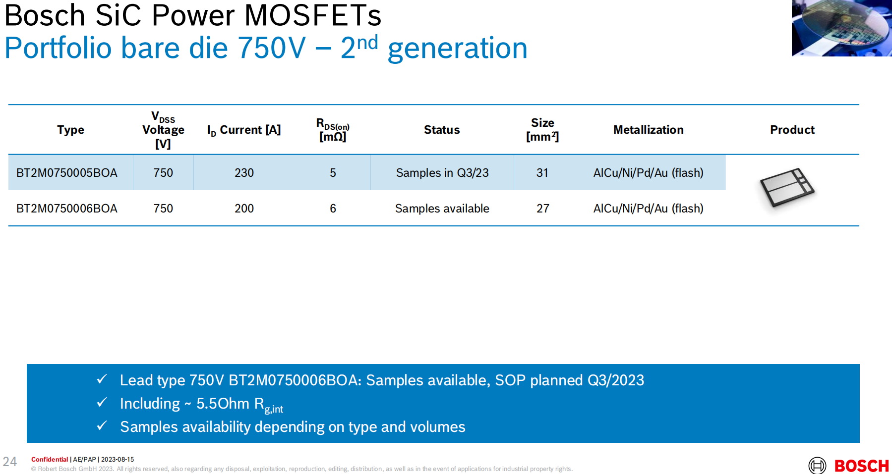 A5:博世提供1200V及750V两种规格的碳化硅芯片: