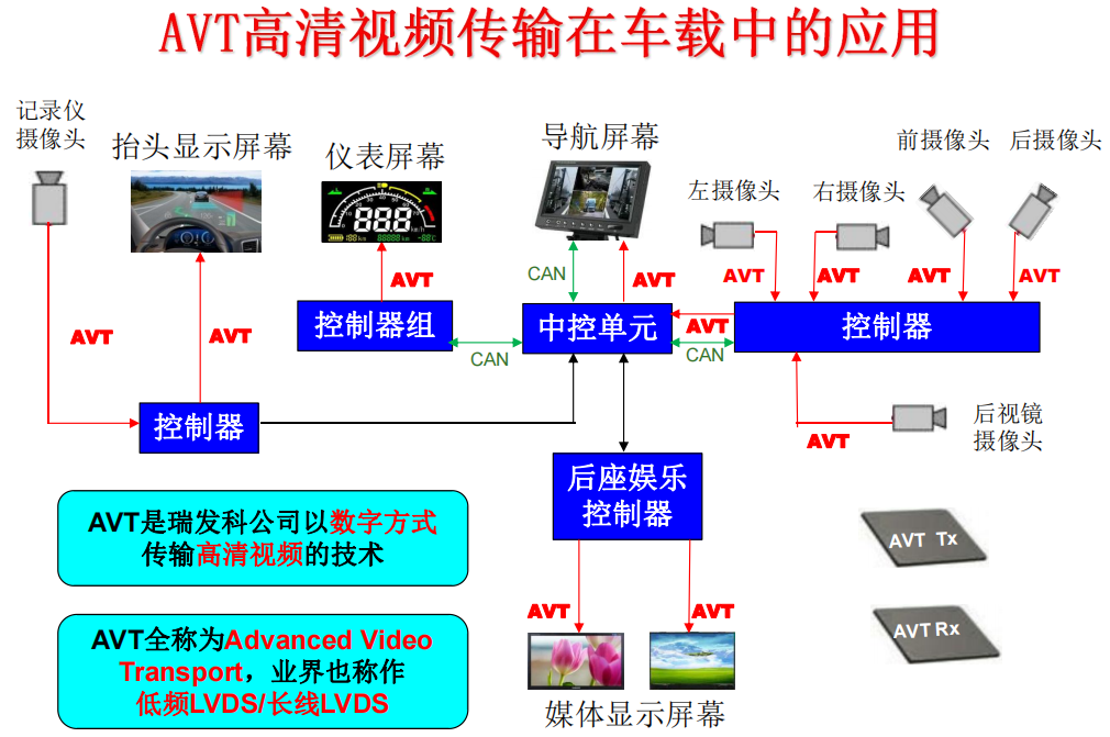 AVT是瑞发科公司以数字方式传输高清LVDS视频信号的技术,全称为Advanced Video Transport,业界也称作低频LVDS/长线LVDS。瑞发科AVT技术既有传输距离长,功耗底、成本低等优势。