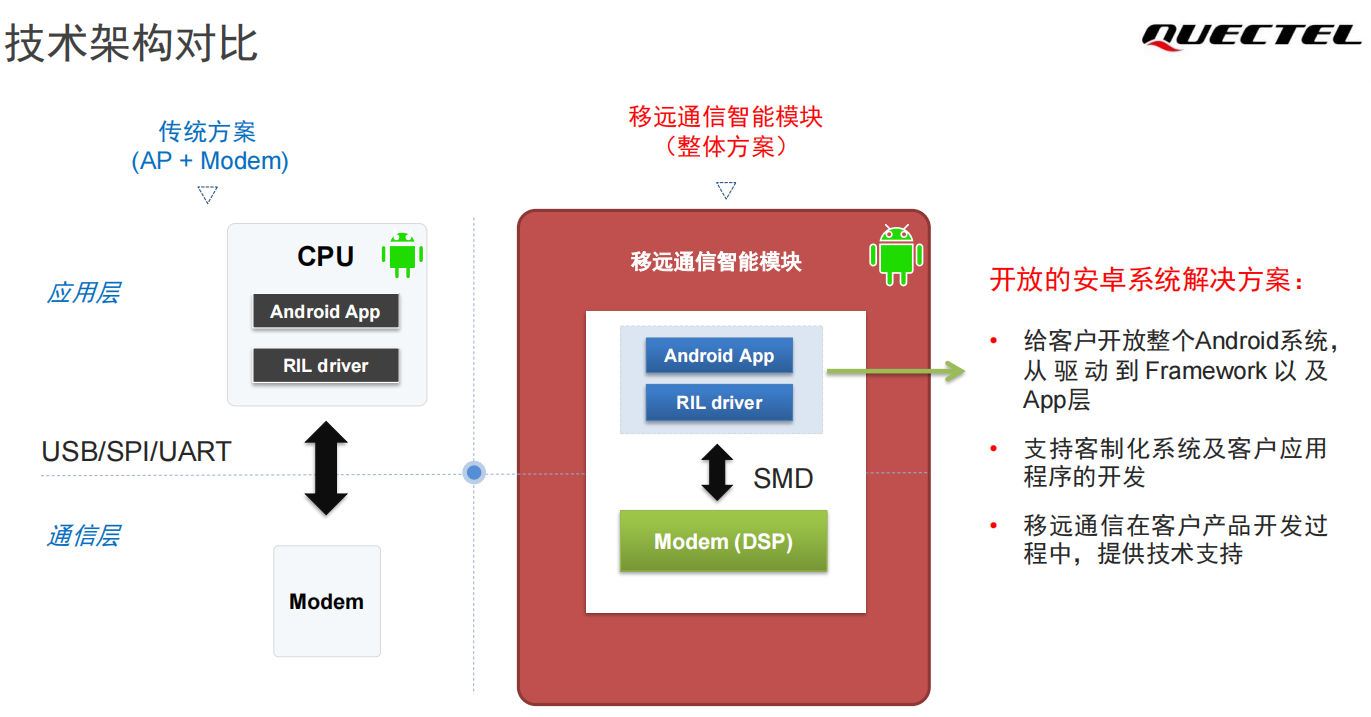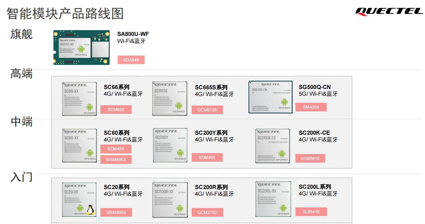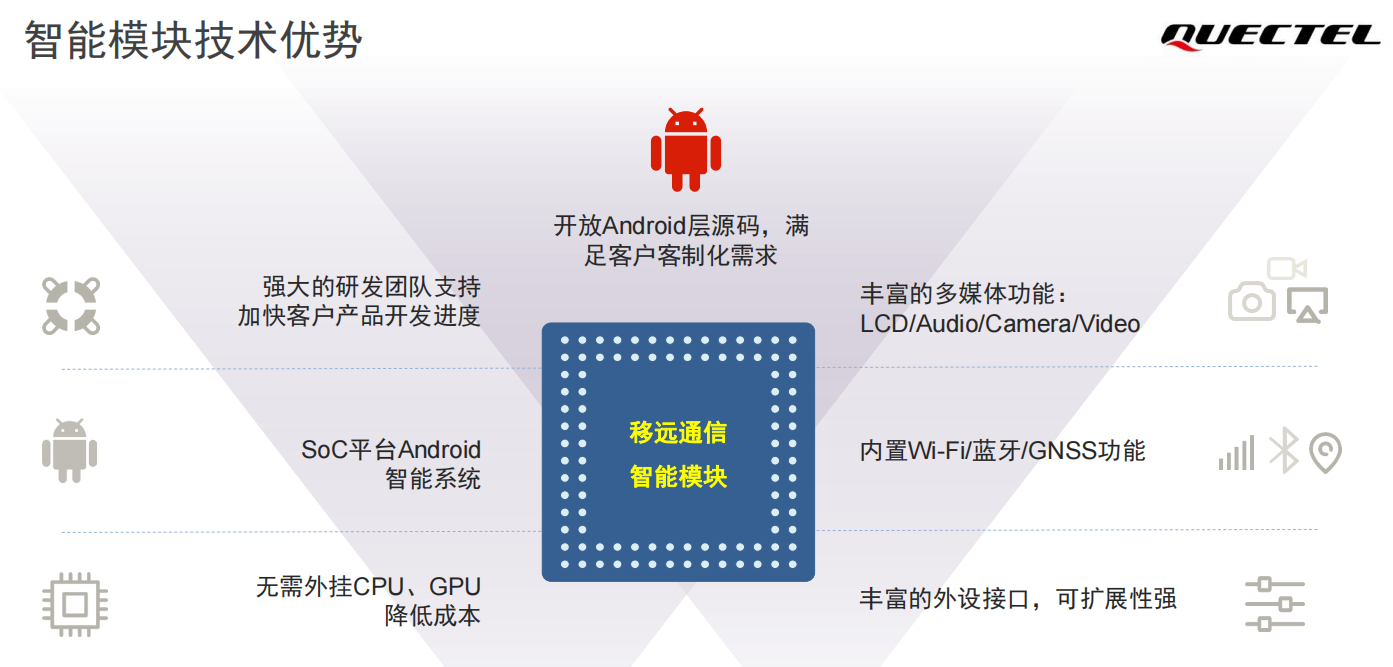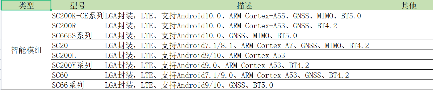 移远通信推出的基于展锐八核 64 位 ARM Cortex-A55 处理器的多网络制式智能 LTE Cat 4 模块,内置 PowerVR Fentale GE8322 高性能图形引擎和 NEON 多媒体处理引擎,搭载 Android 10.0 操作系统。该模块性能强大、多媒体功能丰富,能够满足客户在工业和消费类应用中对高速率和多媒体功能的需求。